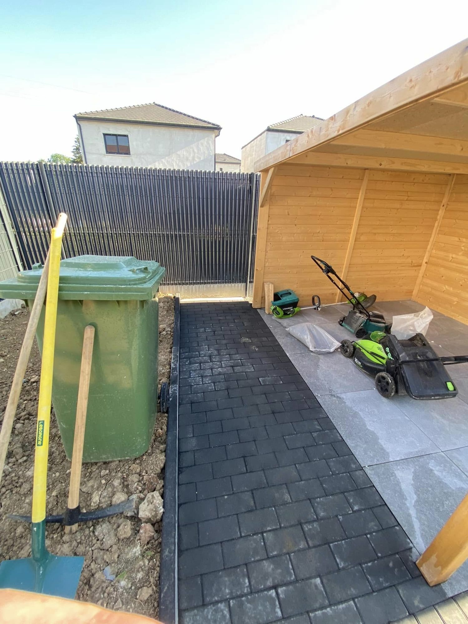 Mise en place de bordure et pavé gris anthracite posé sur chape béton ![]()
